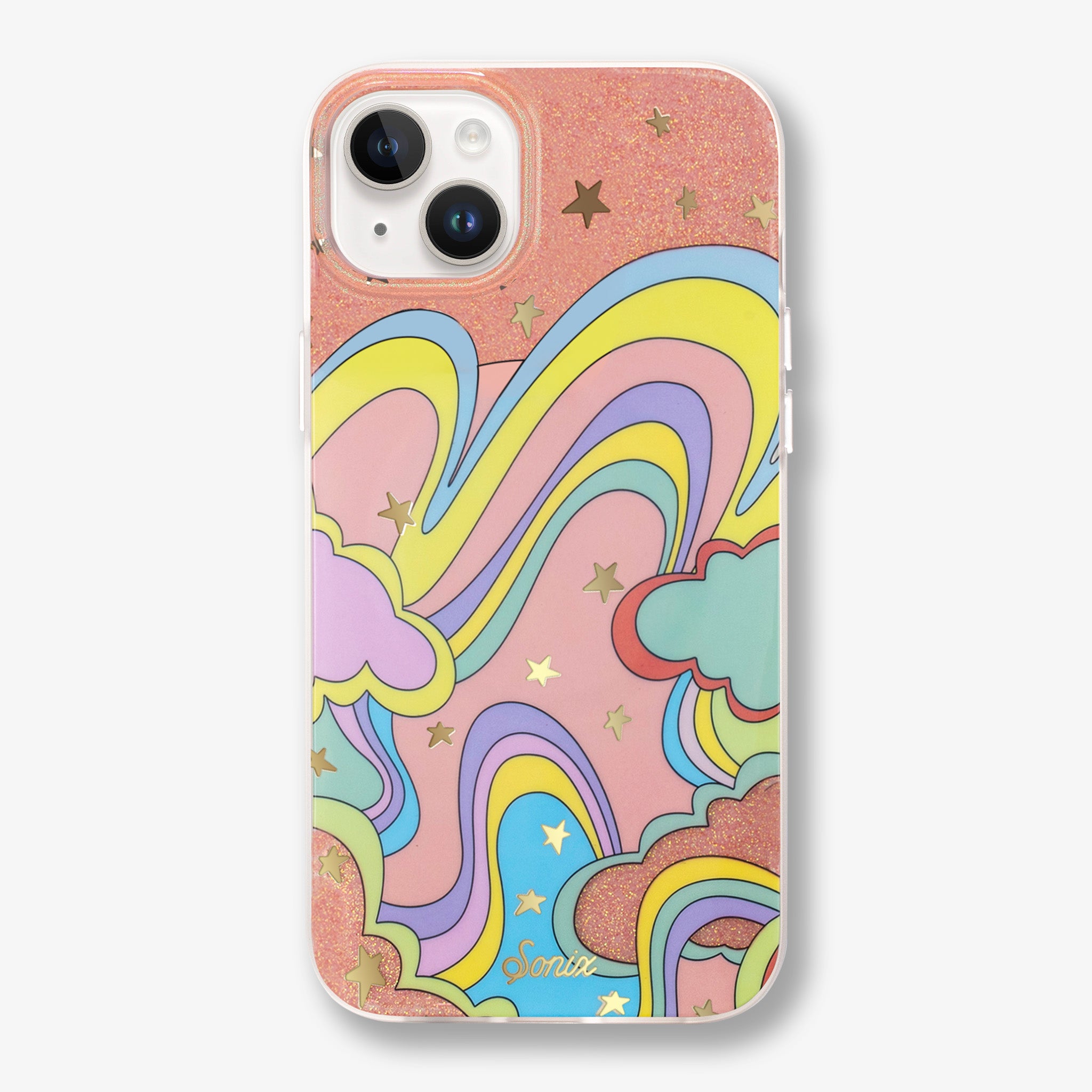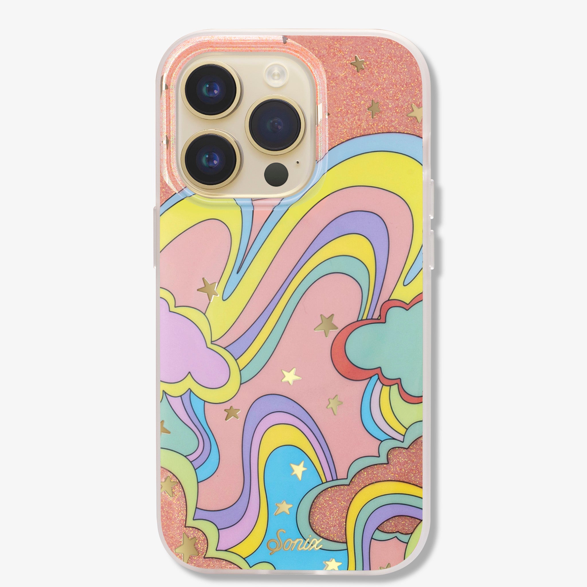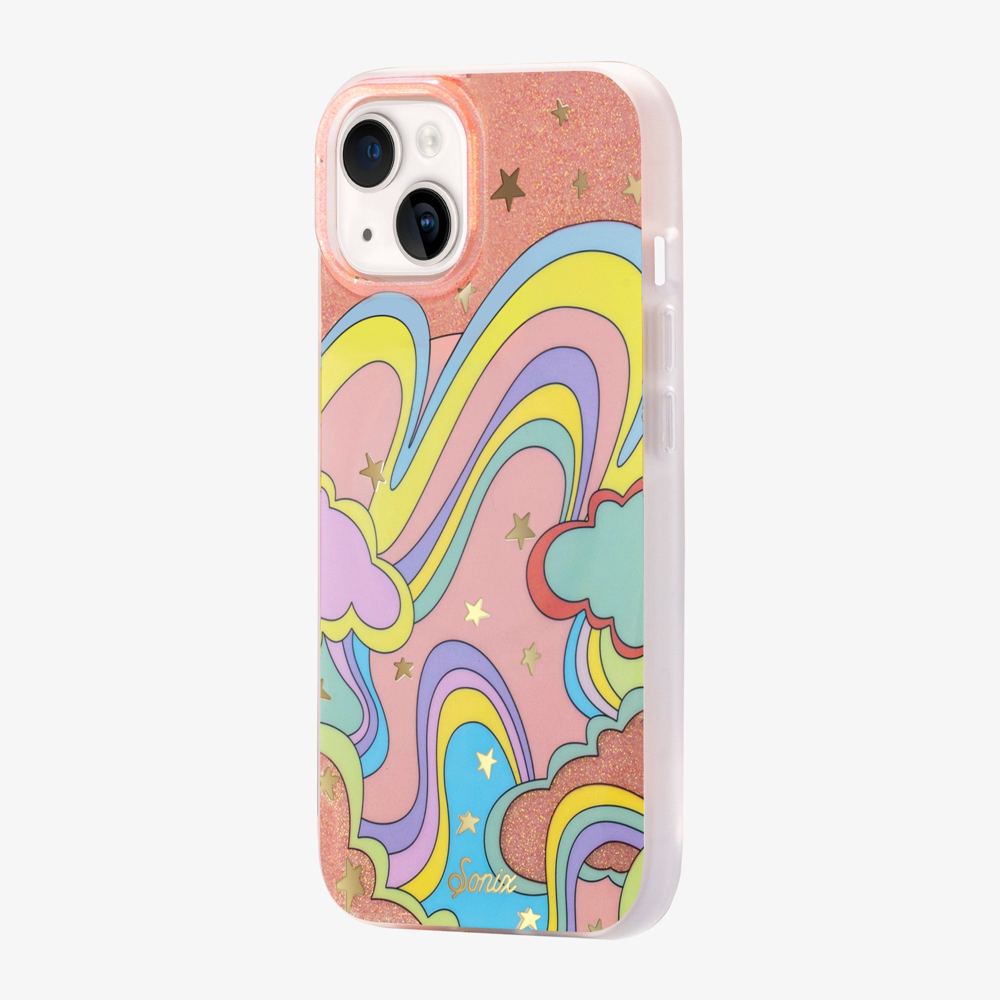 Illusion, MagSafe® Compatible iPhone case features a whimsical, dreamlike design filled with glitter and gold foil star details - creating this fun and festive illusion of another world!