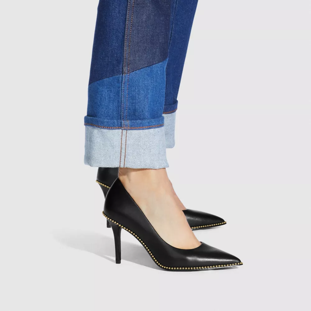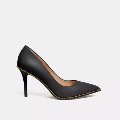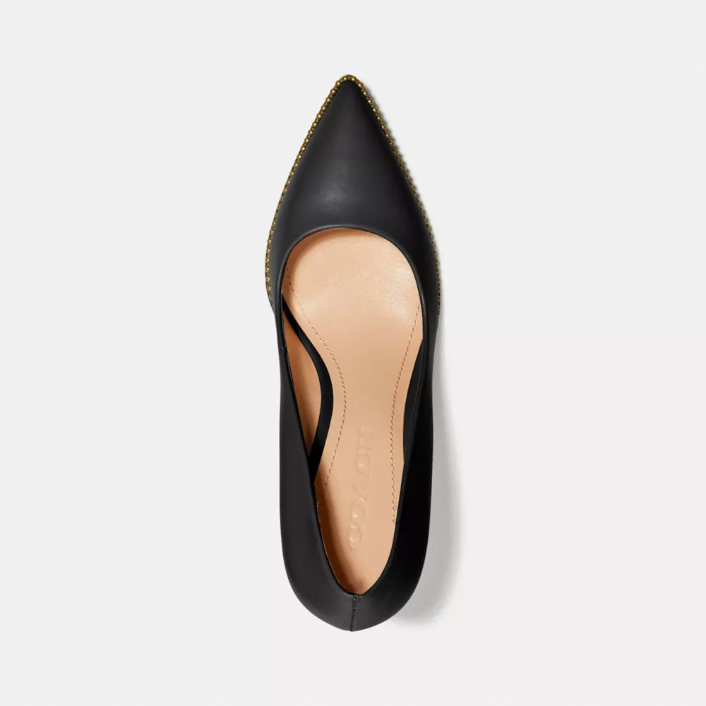 Crafted in smooth leather, this versatile pump is perfect for day or night. Gleaming beadchain detail gives the pointed-toe style a touch of shine.